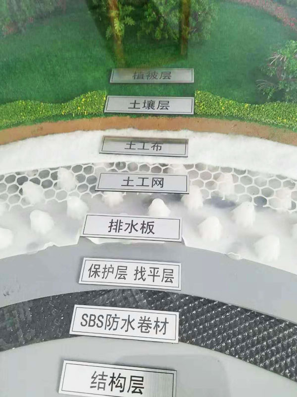 圆锥突台(或中空圆柱形多孔)的塑胶底板,由高抗冲聚苯乙烯(HIPS)制成。圆锥突台(或中空圆柱多孔)的顶面胶接一滤层无纺布,以阻止泥土微粒通过,从而避免通道阻塞,使孔道排水顺畅。